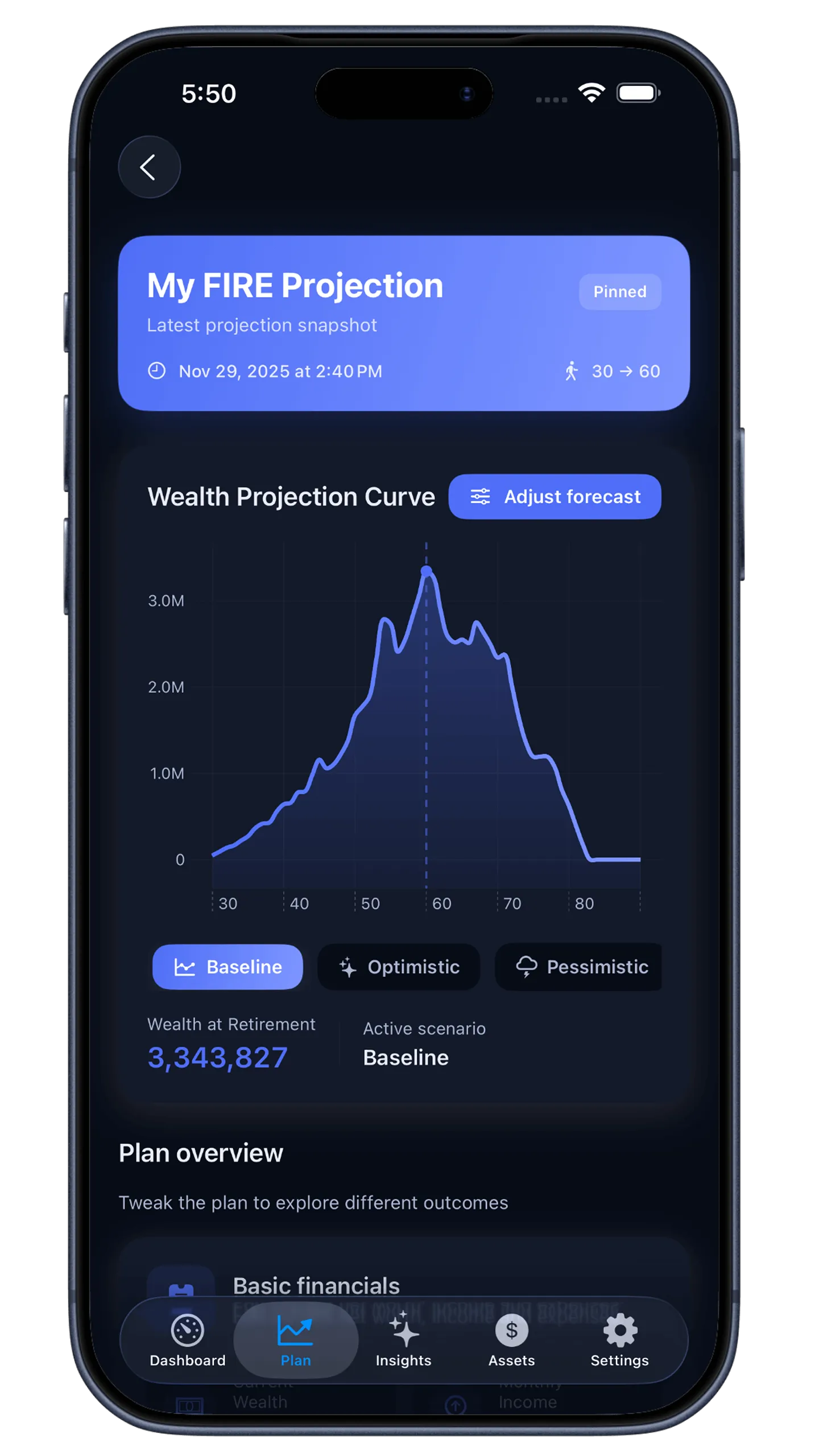 A live dashboard of net worth, FIRE date, and probability bands—always on device.