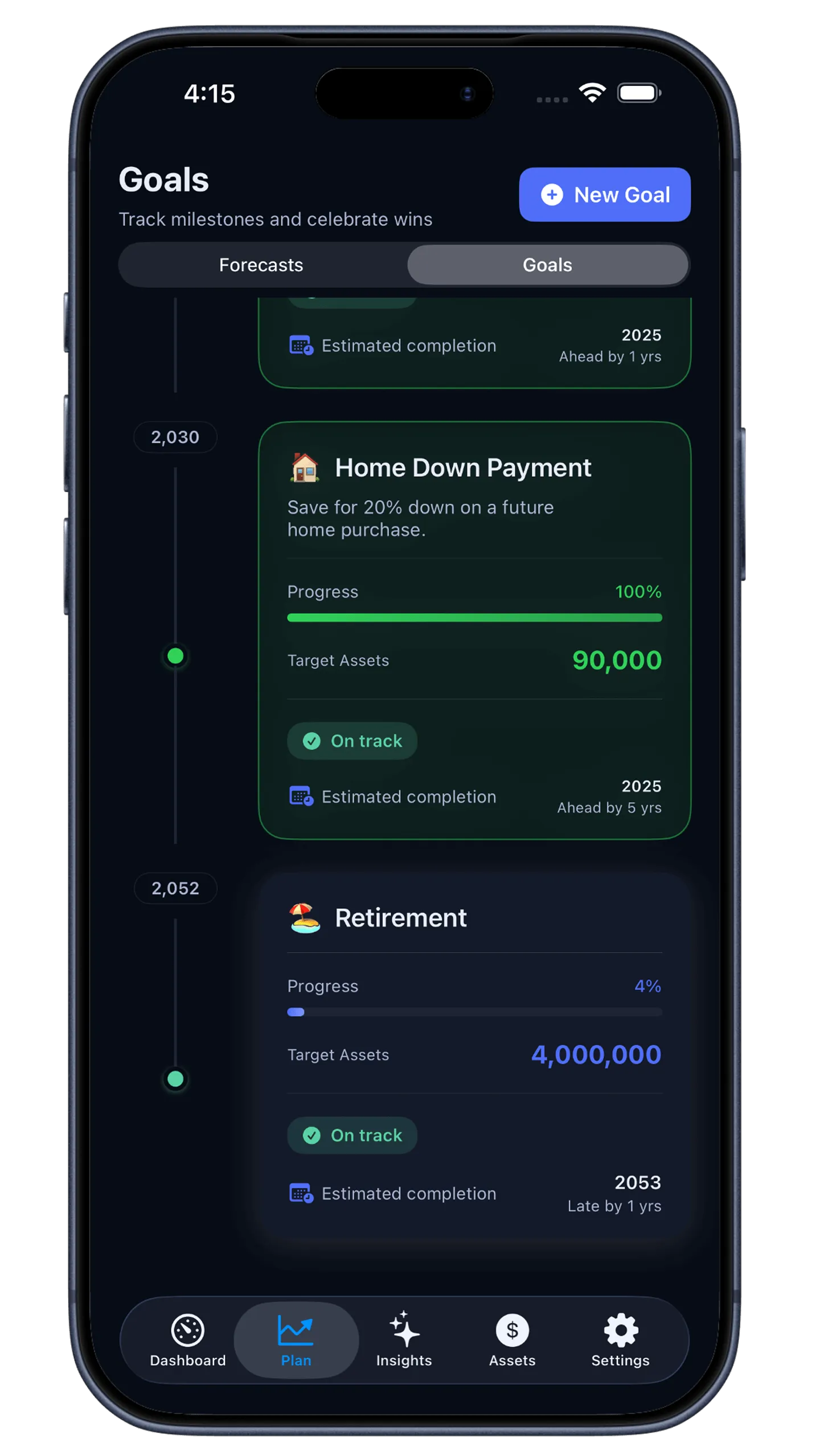 Set goals like "FIRE by 45" or "Down payment in 3 years" and track progress against your timeline. Know what's on track and what needs attention.
