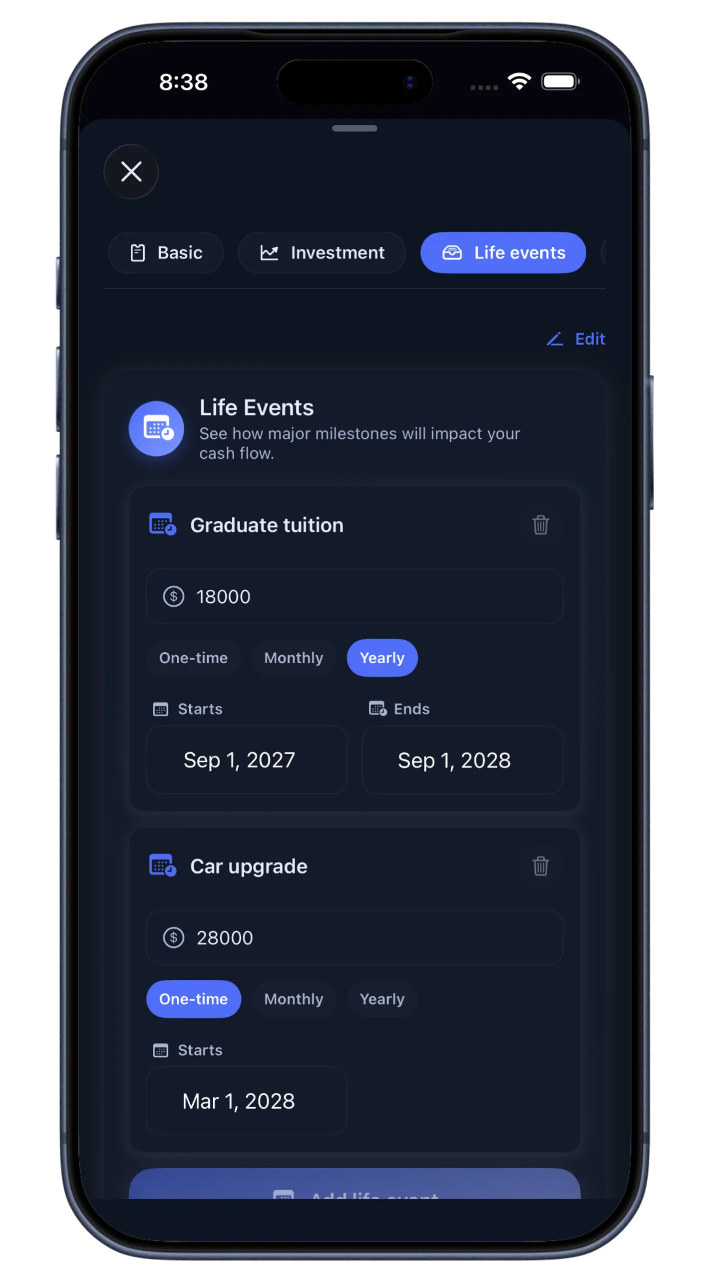 Buying a home in 5 years? Taking a sabbatical? Paying for college? Add Life Events to your timeline and instantly see how they impact your retirement date.